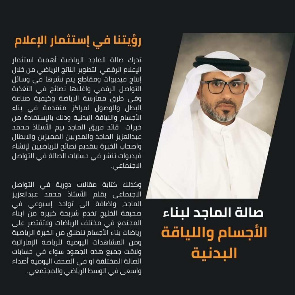 تدرك صالة الماجد الرياضية أهمية استثمار الإعلام الرقمي لتطوير الناتج الرياضي من خلال إنتاج فيديوات ومقاطع يتم نشرها في وسائل التواصل الرقمي، وإعطائهم نصائح في التغذية وفي طرق ممارسة الرياضة حتى تحقيق البطل والوصول لمراكز متقدمة في بناء الأجسام واللياقة البدنية، وذلك بالاستفادة من خبرات قائد صالة الماجد، يتم الأستاذ محمد عبدالعزيز الماجد والمدربين المتميزين والأبطال وأصحاب الخبرة في المجال، ويتم إعداد فيديوات تنشر في حسابات الصالة في التواصل الاجتماعي. وكذلك كتابة مقالات دورية في التواصل الاجتماعي بقلم الأستاذ محمد عبدالعزيز الماجد، وإضافة إلى تواجده الأسبوعي في صحيفة الخليج تخدم شريحة كبيرة من أبناء المجتمع في مختلف الرياضات، وتقتصر على رياضات بناء الأجسام واللياقة البدنية. ومن المشاهدات اليومية بأن الصالة الرياضية تلاقي قبولاً واسعاً من جميع شرائح المجتمع، سواء في صالة الماجد النسائية أو في صالة الماجد للرجال. الهدف هو مواكبة التطور الإعلامي والسعي في الوسط الرياضي والمجتمعي.